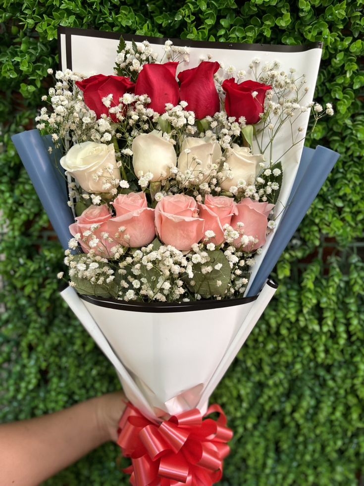 A timeless arrangement of red, pink, and white roses that symbolizes love, passion, and elegance.
